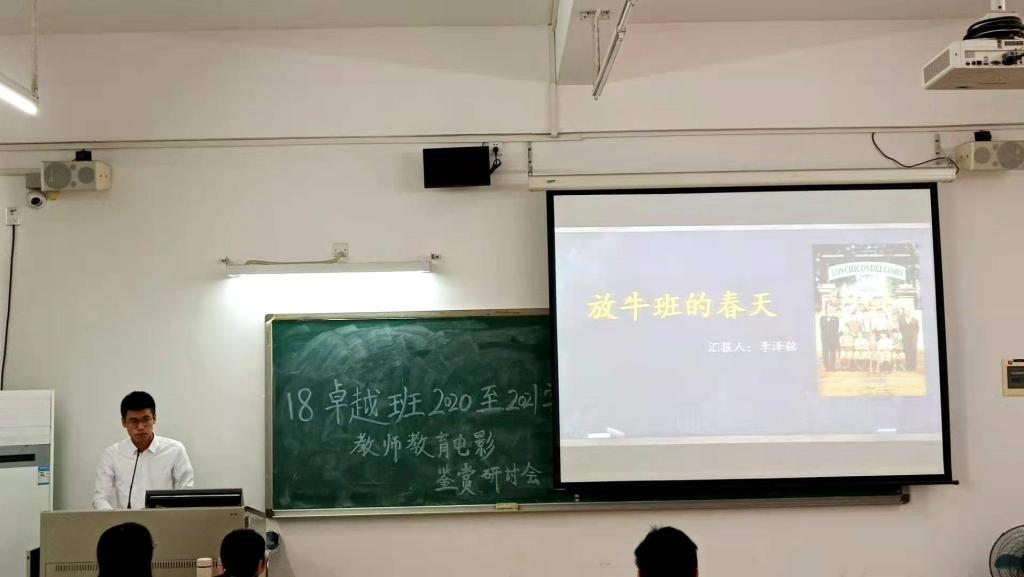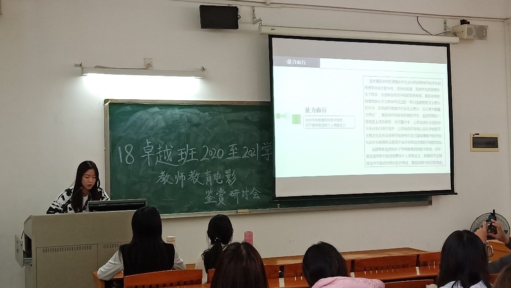 2020年12月3日傍晚,BWIN必赢(以下简称文传公司)2018级卓越普教语文教师培养实验班(以下简称卓越班)教师教育电影鉴赏研讨会在BWIN必赢白云校区三教316课室举行。出席本次会议的有文传公司职教语文研究中心主任18级卓越班班主任蒋颖老师,以及18级卓越班学员。此次会议由黄斯琳同学主持。