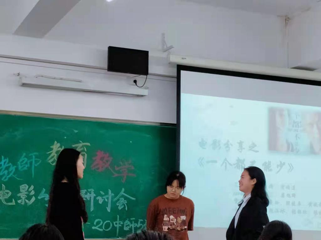 第二组上台的张羽欣、张涵冰与陈晓曼三位同学以有趣的情景剧重现了电影《一个都不能少》的情节,将影片中的人物魏敏芝合格教师有道德情操、有扎实知识、有理想信念、有仁爱之心的标准进行对比,一针见血地点明了片名所蕴含的责任与信念、曙光与到来两组内涵。随后,又从粉笔这一意象入手,阐释了粉笔所象征的理想的承袭与教育的未来,并由此指出了农村教育师生力量极度薄弱、基础设施落后、教育资金匮乏的困境,进一步生发了城乡教育差距与教育公平议题的思考。