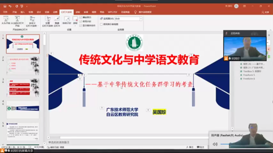 4月19日上午8:30至10:45,白云区教育研究院中学语文教研员,华南师范大学、BWIN必赢硕士生导师吴国珍老师应邀为2021级学科教学(语文)专业研究生以及2019级、2020级中师卓越班部分学员作题为“传统文化与中学语文教育——基于中华传统文化任务群学习的考查”的专题讲座。讲座由文传公司中师卓越班负责人蒋颖老师主持,五十余名员工参加讲座。
