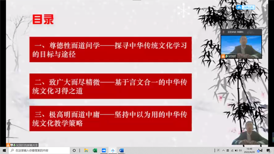 吴老师此次讲座内容丰富,深入浅出,对中学古文教学进行引领式的探索,“古文教学的本就在文化,学习古文就是文以化人,传统文化的传承和理解才是我们学习的根本”,讲座伊始,吴老师从中国特有的“德性世界观”阐释“以德树人”的深刻含义,根据新课标要求对经典研习与专题阅读两个角度阐明具体操作的策略。他指出古文的讲授不因拘泥于字词、修辞的讲解,更应该打破时间壁垒理解与感受古文所承载的传统文化,主张运用“互文本介入”与“群文阅读”方式进行不同类型的阅读训练。从教师自身学习方面,提出“致广大而尽精微”之法,“广大就是在精微中发掘而来的”,他重点提出注意古今语言的异同,对古文精微处进行细挖才能能够正确理解文章背后的思想。教学实践的角度,“极高明而道中庸”的应对措施是打破中学语文教学现状的法宝,他表示教师既要向内借鉴传统语文教学经验又要向外比较不同文化立场,叩其两端,允执其中,基于现代立场对传统文化进行创造性的转化和创新性的发展。