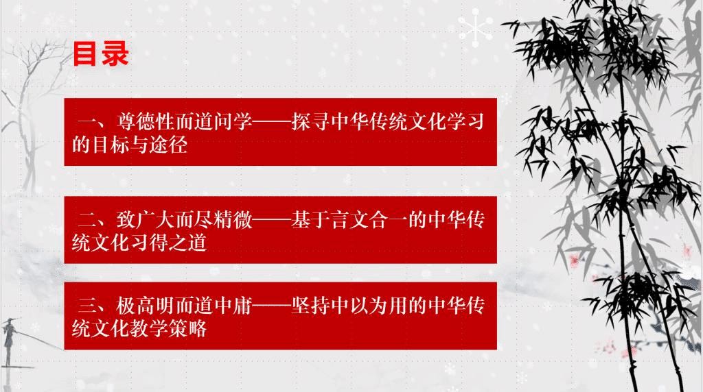 讲座伊始,吴老师就向同学们提问“你的老师是怎么教学古诗文的呢”,引发了同学们的积极回忆与思考。他指出,“字字落实”“主讲语法”和“修辞学习”这三种文言教学方式都各有弊端,我们应该基于中华传统文化来进行文言教学,以此巧妙地引出今天讲座的主题——传统文化与中学语文教育。接下来,他将 “传统文化与中学语文教育”细分为三个专题:一、尊德性而道问学——探寻中华传统文化学习的目标与途径;二、致广大而尽精微——基于言文合一的中华传统文化习得之道;三、极高明而道中庸——坚持中以为用的中华传统文化教学策略。三个专题各有侧重却又协调统一,从宏观的新课程理念到微观的教学设计、文本讲解,全方位为同学们呈现出中华传统文化教育思考与实践启发。