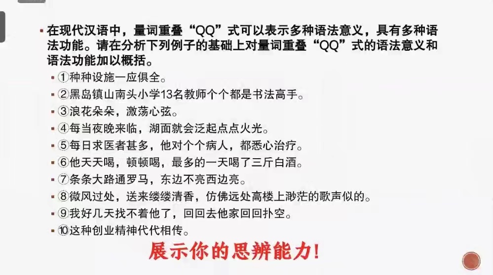 接下来分享经验的是郑晓丽学姐,她从语言学方面向同学们给出指导建议。在论述题和简答题方面,晓丽学姐谈到,语言学题目需要深入挖掘,展示思辨能力。例如“QQ”式的题目,目的不在于考背记的能力,而在思维能力。