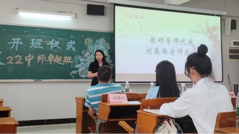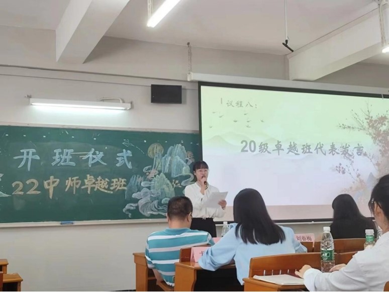 佘爱春首先对刚加入2022级卓越班的同学们表示祝贺,并阐释了“卓越”一词的内涵。随后,对全体22中师卓越班的成员们提出了几点建议:首先要立德修身,自觉锤炼品德修养;其次要静心乐学,夯实学科专业基础;再者要注重综合素质,“赛活”兼修,积极参与各类比赛和活动,成为创新型人才。佘爱春希望同学们始终以“卓越”为奋斗目标,在追求“卓越”、超越“卓越”的道路上秀出自己的风采。