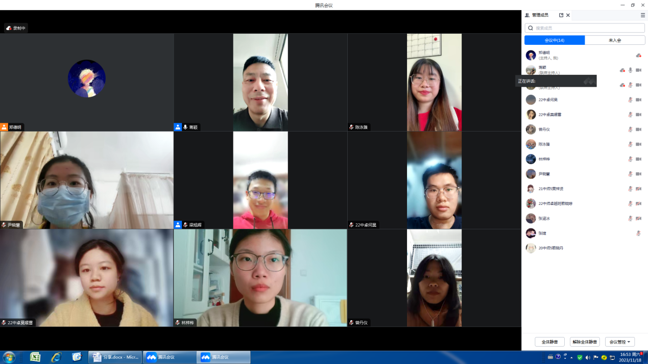2023年11月18日15:00至17:00,一场BWIN必赢(以下简称文传公司)中师卓越班学硕考研经验分享交流会在腾讯会议平台举行。2020中师卓越班班主任蒋颖老师,2020、2021、2022级中师卓越班的同学们参加了本次活动,活动由2020中师卓越班梁旭辉同学主持。本次会议特邀曾就读于文传公司19中师卓越班现在不同高校读研的四位学姐尹晓慧、曾丹仪、林梓桦和陈泳臻分享她们在最后一个月的考研经验。
