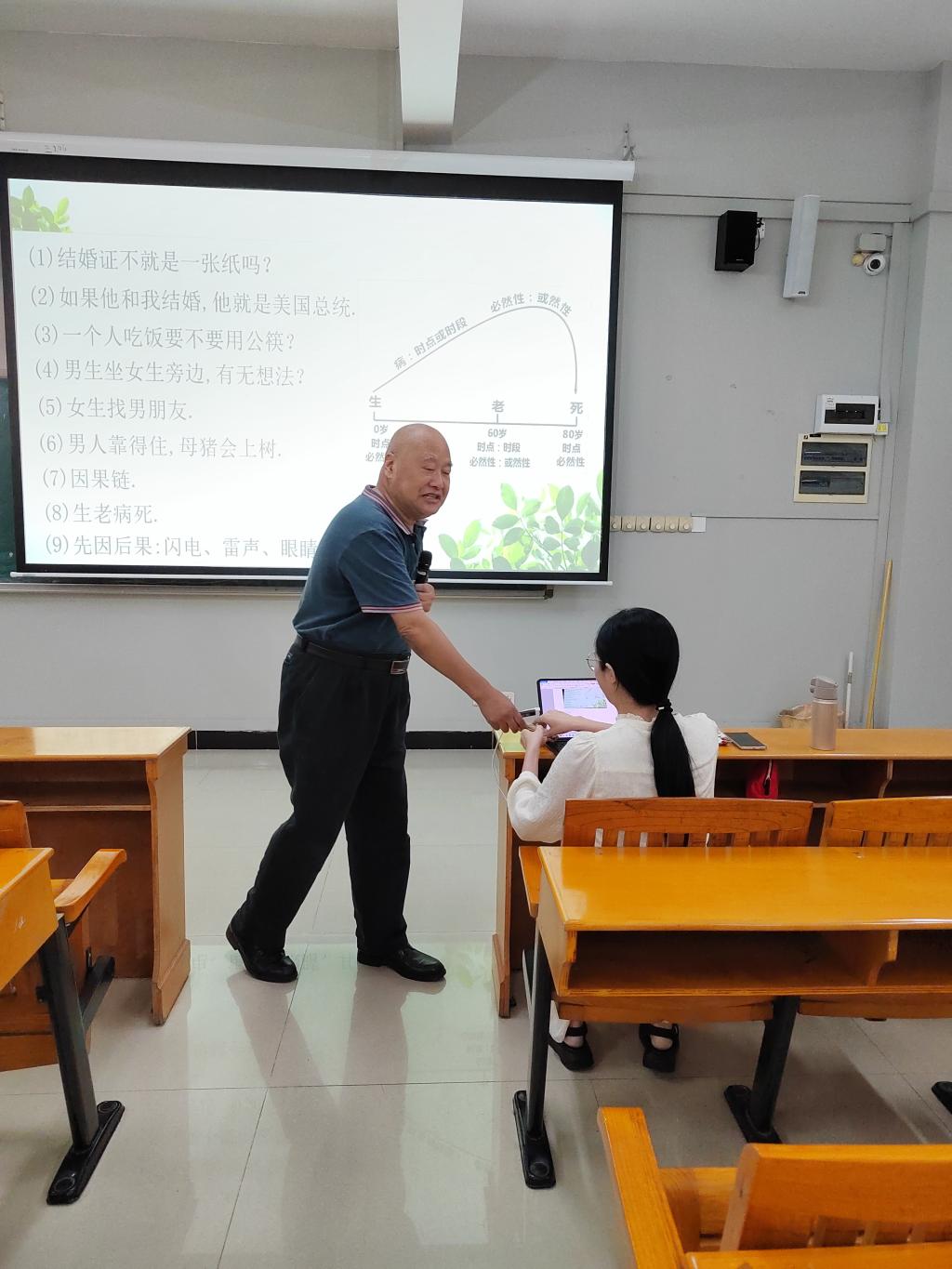 接着是矛盾律,在讲解时段教授重点讲解了命题的性质判断类型,判断命题真假的两种形式,悖论问题的表现方式并指出破解悖论的方法,启发同学们找出产生悖论的关键,并破除悖论带来的困境。