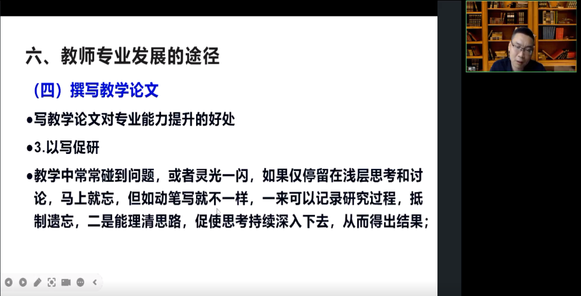 本次讲座周老师紧扣教师职业发展的中心主题,从“教师职业的特点与挑战”、“教师职业发展的适应期”、“教师职业发展路径”、“教师专业发展的意义”、“教师专业发展路径”五个维度阐释新教师成长之道,并重点就“专业发展路径”的诸多方向进行了详细讲解。
