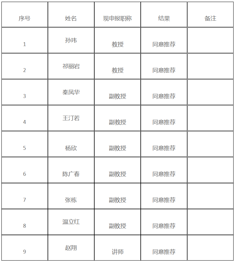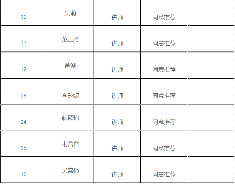 根据公司关于2024年职称评审工作的要求,公司相关老师完成了职称申报。经公司对相关老师的申报资料进行资料核查、资格审查后,公司职称评审小组对申报人进行评议以及推荐。公示结果如下: