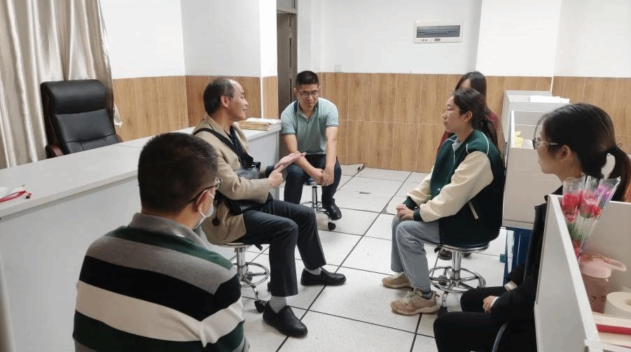 紧接着,在长岭居小学总务处齐主任的陪同下,佘爱春老师与刘汉光老师前往办公室与实习生进行交流,了解实习生这两个月以来在长岭居小学的实习情况。实习生就听课、课堂教学、评课、班级管理等向两位老师汇报工作情况,分享实习过程中的收获和感悟,也对实习过程中遇到的一些问题向老师进行提问。两位老师对实习生的工作情况表示肯定,就员工们提出的问题进行了解答,并提出:“要抓住一切上讲台的机会,多上讲台,在教学实践中锻炼自己。”