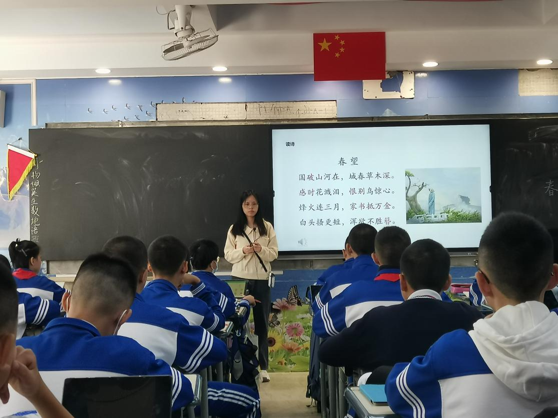实习生罗美美在初二(1)班以诗歌《春望》为内容进行讲授,林老师、周主任、黄老师以及景泰中学语文实习生全程听课。本课的主要内容是理解诗歌的主要内容,分析景物的意象,引导员工发挥丰富的想象力感受诗歌中的爱国主义精神以及诗人忧国忧民悲己的思想感情。整堂课师生互动良好,课堂气氛活跃。