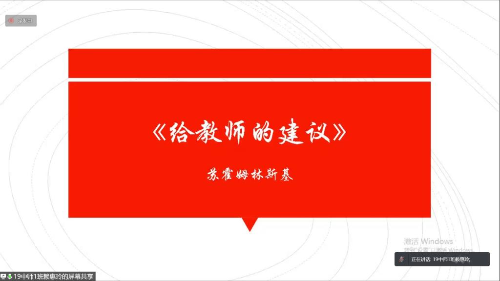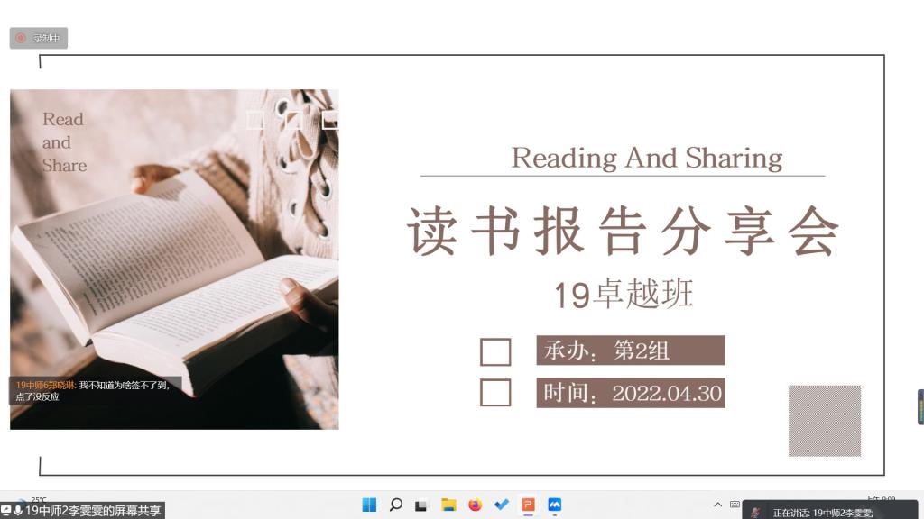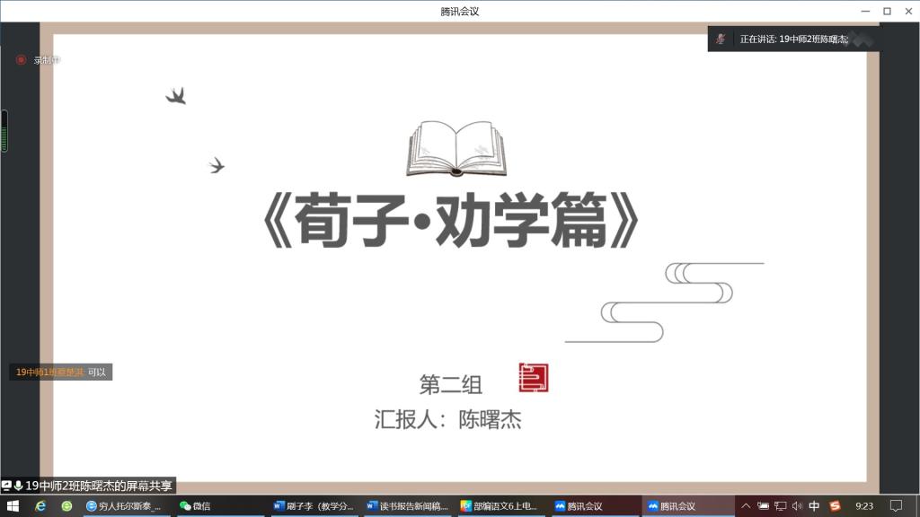 2022年4月30日上午9:00-11:00,BWIN必赢(以下简称文传公司)2019级卓越普教语文教师培养实验班(以下简称19卓越班)通过腾讯会议举行了中外教育名篇读书报告分享会。出席本次分享会的有文传公司副经理佘爱春老师、卓越班班主任蒋颖老师、学业导师刘茉琳老师以及19卓越班全体成员。此次会议由李雯雯同学主持。