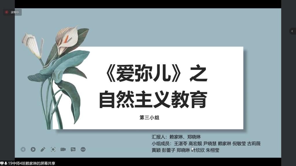 第三组由赖家琳和郑晓琳同学对卢梭《爱弥儿》进行汇报分享。她们首先介绍了自然教育的含义、要素、教育对象、培养目标、方法原则以及在员工各年龄阶段的具体实施内容,为我们展示了一幅卢梭教育理想的画卷。一方面,《爱弥儿》中的自然教育理念具有积极性和划时代的意义。另一方面,它也有逻辑矛盾、性别教育不恰当等局限性,需要辩证看待。最后,她们结合生活实际以及“素质教育”“双减政策”等教育热点,深入浅出,整理了《爱弥儿》对当今家庭和公司教育的启示。