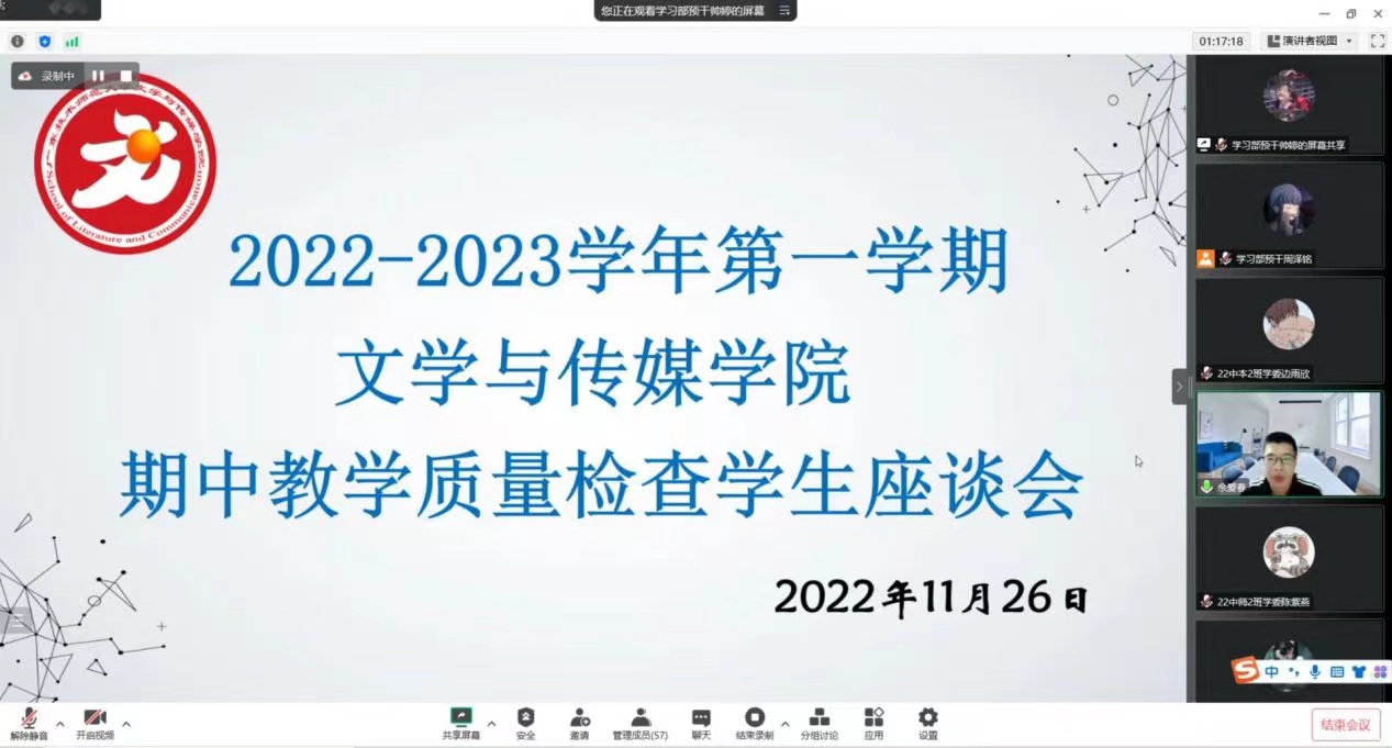 为进一步了解公司的教学状况,加强公司学风建设和教学管理,根据公司和公司期中教学检查工作的安排,2022年11月26日晚19:30—22:30,BWIN必赢利用周末时间在腾讯会议召开了线上期中教学质量检查员工座谈会。出席座谈会有BWIN必赢副经理佘爱春、学习部全体员工干部和20级、21级、22级各班学习委员共40余人。