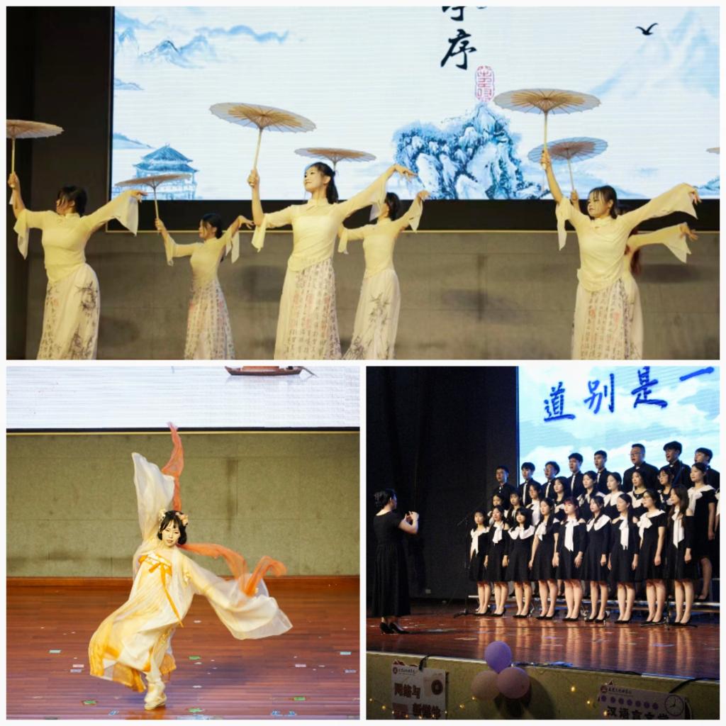 “云想衣裳花想容,春风拂槛露华浓”,黄紫雯等同学带来的“华章古韵”服装秀及书法展示,每一件华服都如同流转的诗篇,讲述着千年的故事与传奇,当笔墨挥舞在宣纸之上,我们看到了中华文化的博大精深;“怒发冲冠凭栏处”,这是房婕、林小桥同学带来的朗诵篇目——《满江红》改编,当豪情壮志遇上现代音乐的流转旋律,传统与现代的碰撞绽放出气势磅礴的火花;文人雅士,相聚兰亭,饮酒赋诗,畅谈人生,校舞蹈队演绎的《兰亭序》,舞姿曼妙,充分感受花月夜之美;由校合唱团带来的《道别是一件难事》,代表着今夜诗词盛会将至道别时刻,但这段有关诗词的记忆会存留于心,如同夜幕低垂下的星光点点。