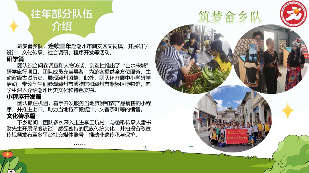 筑梦畲乡队的陈雯从对策探索、影响性成果、服务评价等方面进行介绍。团队将“研学”融入实践活动,涵盖了农业、文化、娱乐等多个领域,利用新媒体手段助力畲乡文旅高质量崛起。陈雯建议团队实践要深入了解当地的历史,从历史故事中汲取创作思路,挖掘当地特色产业。