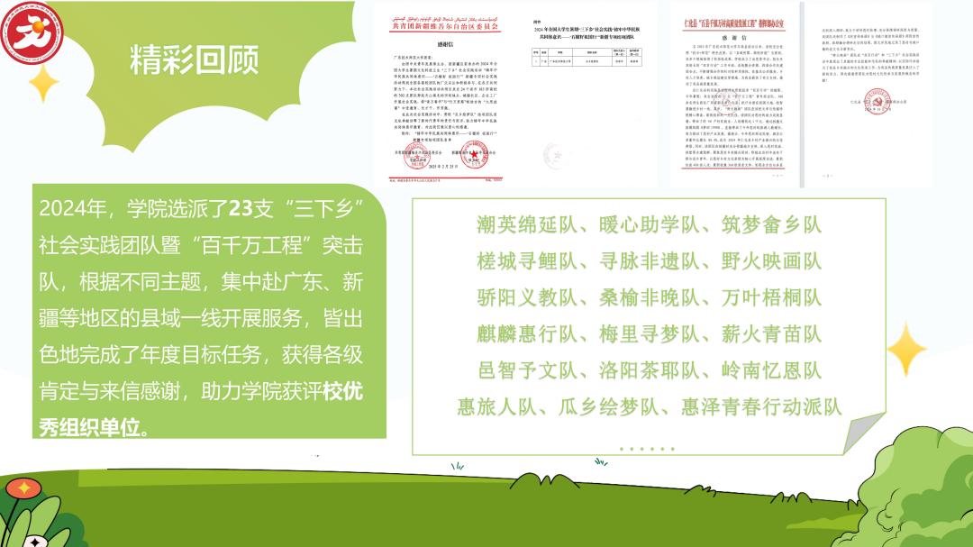 会议伊始,主持人为大家介绍了去年BWIN必赢选派的二十三支“三下乡”社会实践团队暨“百千万工程”突击队情况,各队围绕不同主题,怀揣着服务乡村的同等热忱,在不同领域绽放光彩。接着,主持人依次介绍了优秀队伍代表,分别是野火映画队、筑梦畲乡队、薪火青苗队。