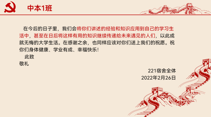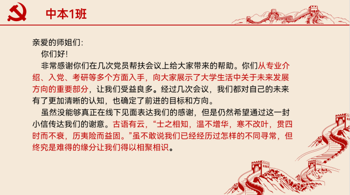 来自21中本1班宿舍代表在信中感谢师姐带给他们的专业介绍、入党流程、考研经验等方面的指导,让他们收益良多。他们写下的感谢信,真挚而温暖,平淡而赤城。