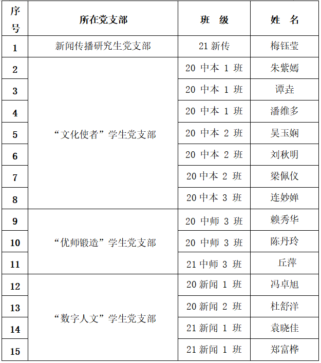经党组织培养考察,梅钰莹等15位同志预备期将满。根据《BWIN必赢发展党员工作实施细则》(广师党委〔2019〕133号)的有关规定,现将其予以公示。