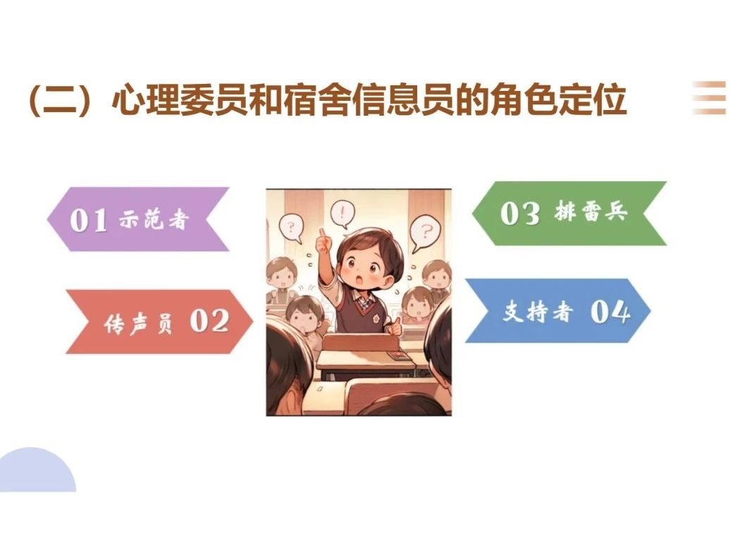 心理委员和宿舍信息员需明确好以下的自身定位: