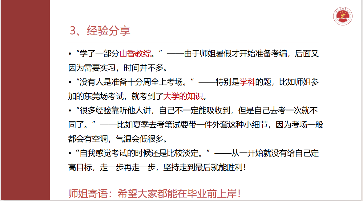 第二位上岸佛山某教师编的师姐则为同学们详细说明了考编的流程。师姐不断提醒我们考编首先要时刻关注每个地方的招聘信息,其次要确立明确的目标、收集当地的考编信息。最后师姐从笔试教综合面试说课的方面与同学们分享了考编的经验。